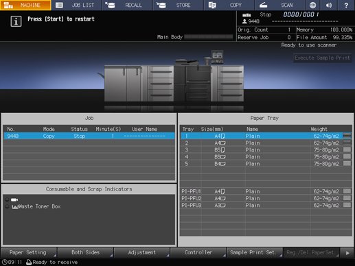 The machine can be set to resume printing automatically after taking out the printed sheets and the primary (main) tray goes up completely. Or, you can set to resume printing automatically by pressing Start on the control panel while the primary (main) tray goes up. Contact your service representative.