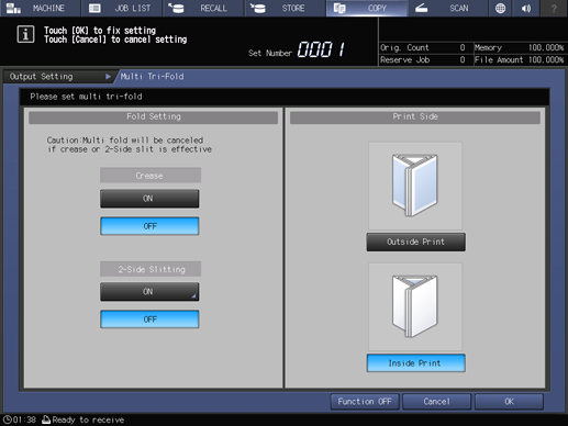 • supplementary explanationThe number of original sheets to be loaded is set to that for Multi Tri-Fold. For details about the number of sheets folded in Multi-Fold, refer to Saddle Stitcher SD-513.