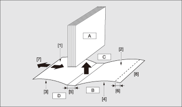 A: Body set B: Cover C: Head D: Foot | [1] Back side of front cover [2] Back side of back cover [3] Front side of front cover [4] Front side of back cover [5] Spine width [6] Cover trimming [7] Cover lead edge adjustment [8] Left binding (upside down for right binding) |