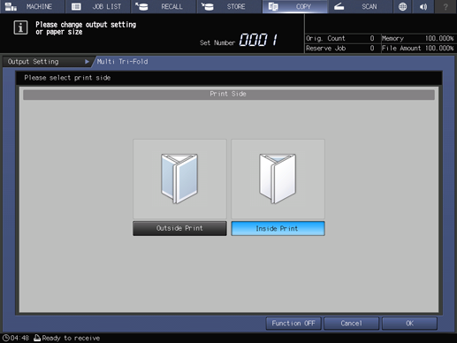 Finisher FS-532 mounted with Saddle Stitcher SD-510 allows the machine to copy on A4 short edge feed or 8.5 11 short edge feedpaper and tri-fold prints can be made. When selecting Tri-Fold, also select either inside or outside to have the printed image.