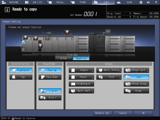 The front image of the machine provided on the Output Setting screen shows that the folder tray is currently selected as an output tray.