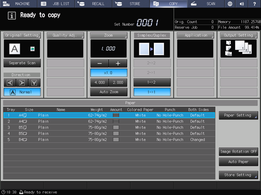 Turn on the main power switch and sub power switch for two machines connected to use the tandem mode, and then display the Copy Screen for each.