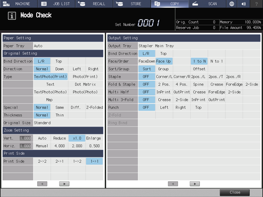 • supplementary explanationThe current settings of Paper Setting, Original Setting, Zoom Setting, Print Side, and Quality Adjustment are displayed in the left side area of the Mode Check screen. To switch the display, press or right at the bottom of the screen.