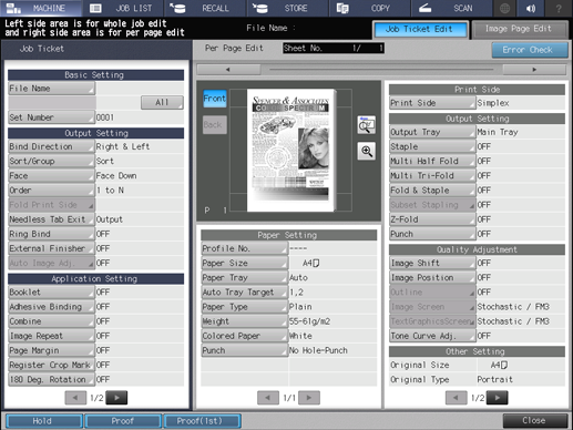 • supplementary explanationPress Proof on the Job Ticket Edit screen to output a sample set. Pressing Proof (1st), if displayed, will output only the first sheet of the whole set.