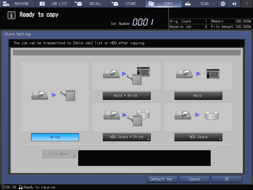 With Hold or HDD Store selected, a job is held or saved on the HDD without being copied.