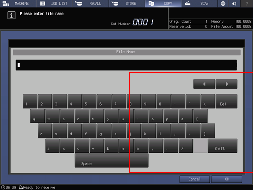 Press File Name on the Store Setting screen to display the File Name dialog box, enter the file name, then press OK.