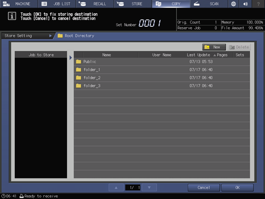 Select HDD Store + Print or HDD Store to display the Root Directory screen, then specify the location to save an HDD saved job.