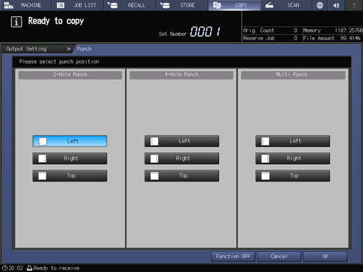Set the Punch mode to punch file holes in printed sheets. Follow the procedure below to select the paper size (A4 long edge feed, 8.5 11 long edge feed) and punch position. To select the punch hole type, change the die set to the desired one.
