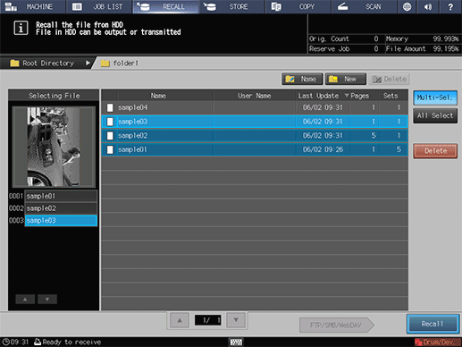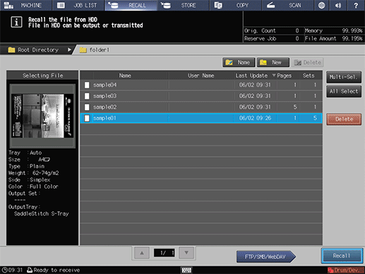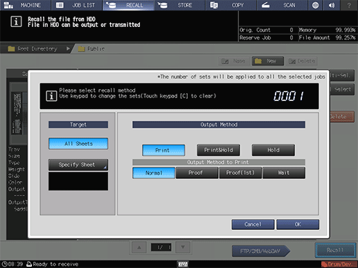 A HDD saved job contains the setting information of the number of sets. You can change it as desired when recalling it.