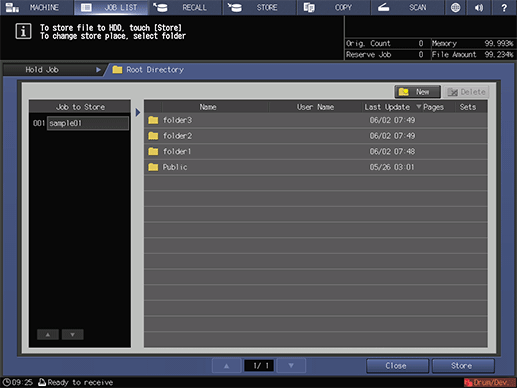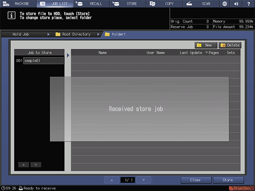 When Received store job is displayed, press Close. The specified hold job is saved as a HDD saved job.