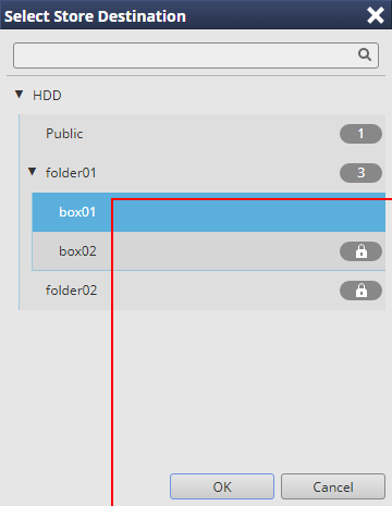 supplementary explanationWhen storing a job in a Box (third layer) on HDD, select a Box in the tree of the Select Store Destination screen, then click OK.