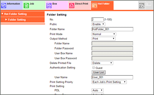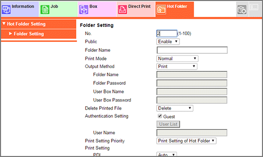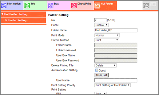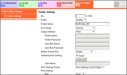 • To use the Hot Folder function, set Enhanced Security Mode to OFF. For details on the Enhanced Security Mode, refer to Enhanced Security Mode.