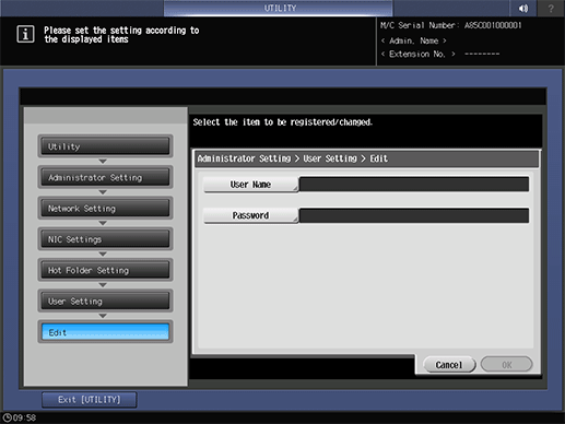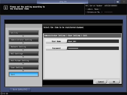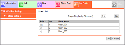 • The user setting (user name and password) of the Hot Folder can also be registered by using Web Connection. For details about Web Connection, refer to About User Setting.