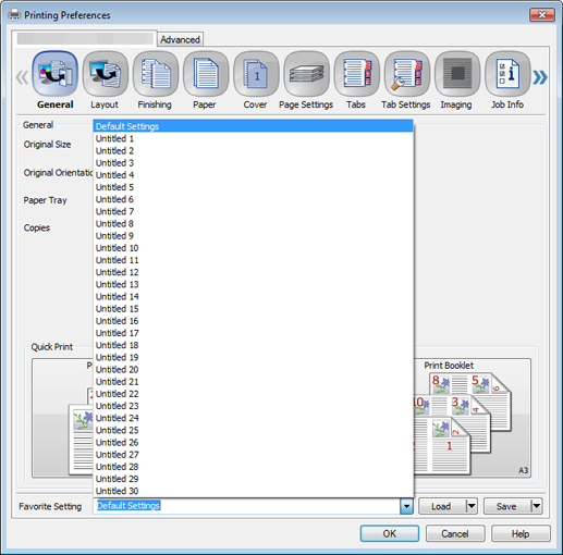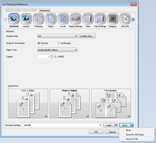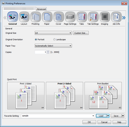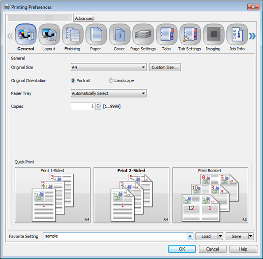 Favorite Setting is available only for the PS Plug-in driver and PCL driver. General is available only for the PS Plug-in driver, and My Tab only for the PCL driver. These functions are not available for other drivers.