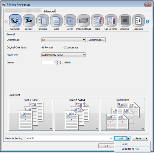 • supplementary explanationIf you select Load from File in the Load pull-down menu, you can open data (print setting file) written to the file and recall the desired setting.