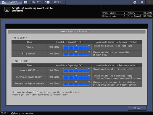 If available memory space runs out, the job may be stopped. Follow the instruction shown in Available Capacity Recovery Method to increase the amount of available memory space.