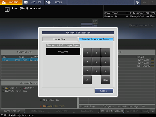 One copy is output, and the reference image for automatic inspection is created. Check whether or not output paper is erroneous. After output, the Auto Inspection screen is automatically displayed on the control panel.