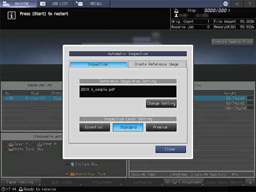 Press Inspection, and confirm Reference Image/Area Setting and Inspection Level Setting.