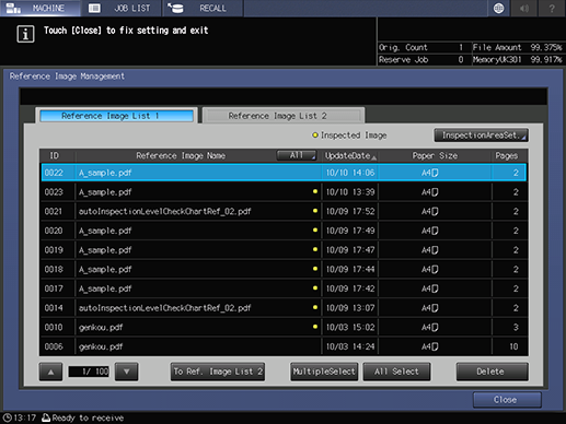 • supplementary explanationYou can also select Reference Image Selection - InspectionAreaSet. on the Job Ticket screen to specify the desired area.