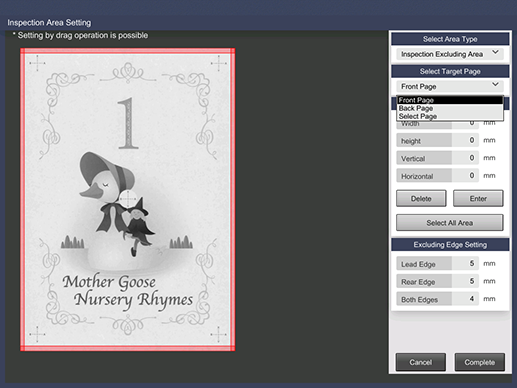 Select the page that is targeted for automatic inspection. There are three types of pages: Front Page, Back Page, and Select Page, in each of which you can specify a different area. Only one page is specifiable for Select Page.
