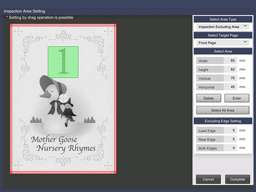 Specify the area that is not targeted for automatic inspection. This function prevents an unnecessary error from occurring when a part of an image is intentionally changed and output for variable printing, which enhances the inspection efficiency.
