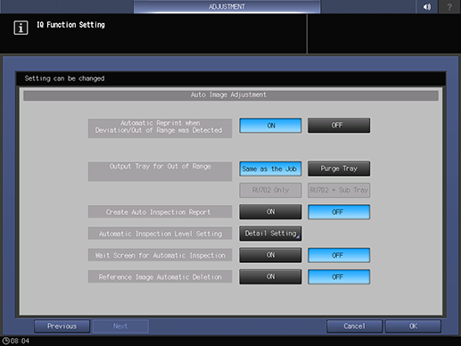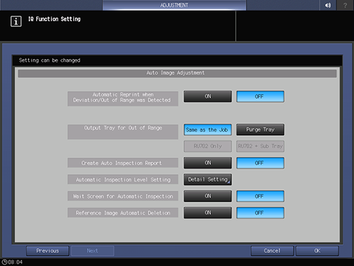 To avoid page duplication, a printout, in which an error is detected by automatic inspection, is output to the same tray as normal printouts, not the Purge Tray. Reprinting is not performed. This setting is available if you want to reduce paper loss or use paper remaining in the machine at the same time.