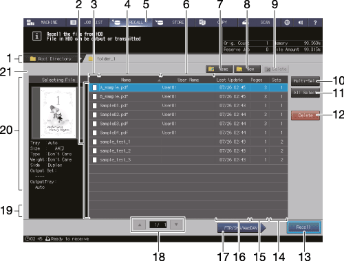 Press before selecting multiple HDD saved jobs in the list. Press first, then select jobs by pressing jobs in the job list. Press Multi-Sel. again to cancel this function. You cannot select the folders or user boxes displayed.