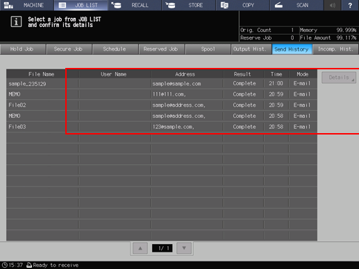 7 | Mode | Displays a send job mode (Email, HDD, FTP, SMB, WebDAV, USB, or TWAIN). When selecting multiple destinations, only one destination is displayed. (The order of priority is: Email - HDD - FTP - SMB - WebDAV - USB - TWAIN) |