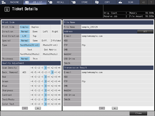 Details of each job can be checked on the Ticket Details screen.