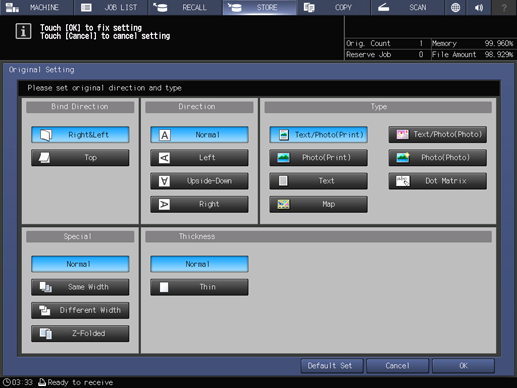 You can set separate scan, bind direction of two-sided original (whether the top and bottom of both sides are the same, or one side is flipped vertically), original orientation, and original type.