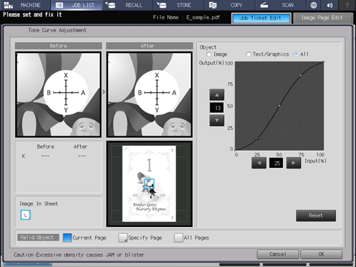 You can adjust each color's overall brightness and contrast by collectively changing tone curves to the image data in the hold job. You can also adjust the tone curve of each tag (image or text/graphics).