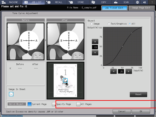 • supplementary explanationWhen you press Specify Page, the Specify Page dialog is displayed. Enter the page number with either the keypad on the screen or the keypad on the control panel. When specifying the pages, delimit the page with ,. When specifying the range, use -. Press OK to return to the Tone Curve Adjustment dialog.