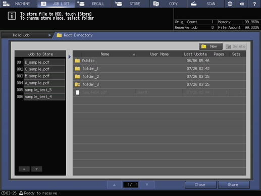 supplementary explanationYou can also create a new folder or user box to save the job. For details about how to create a folder and user box, refer to Folder and User Box.