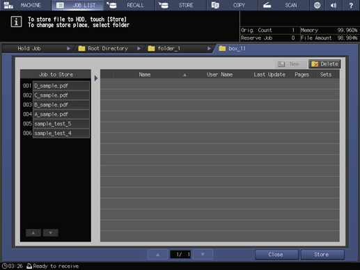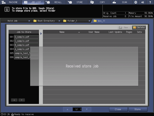 The machine stores the job selected in step 3 onto the directory specified in step 5 of the HDD.