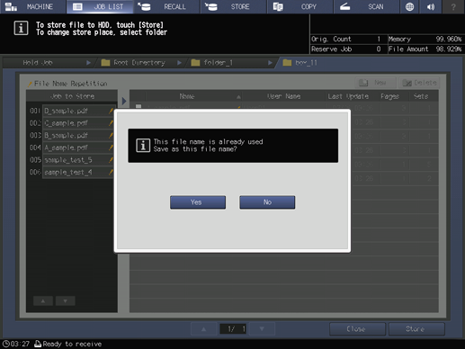 supplementary explanationIf the file name of the job has been duplicated, a confirmation dialog will be displayed. Press Yes to save it or press No to cancel.