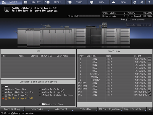 When the saddle stitcher slit scrap box of Saddle Stitcher SD-513 becomes full, the following message appears in the message area of the screen.