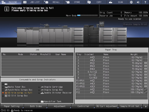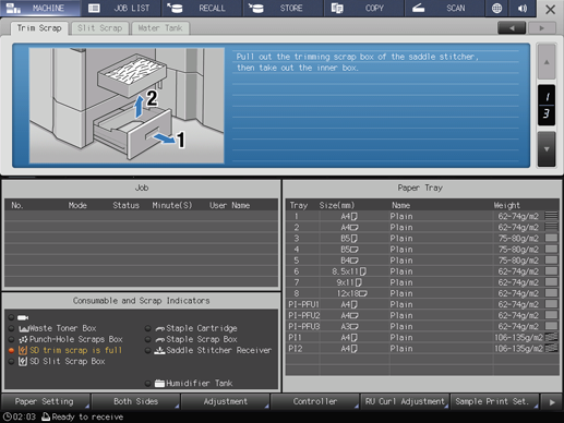 When the fore-edge trimming scrap box of Saddle Stitcher SD-513 becomes full, the following message appears in the message area of the screen.