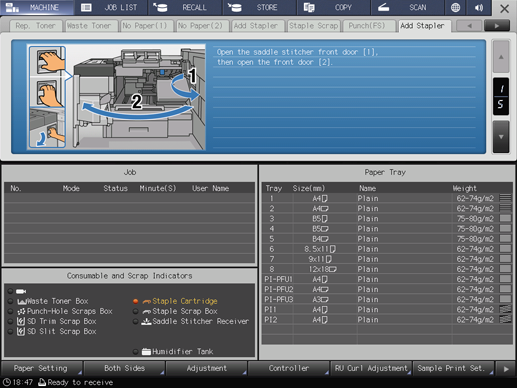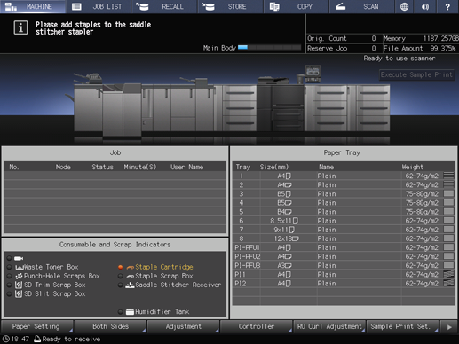 When the staple cartridge of Saddle Stitcher SD-513 becomes empty, the following message will appear in the message area of the screen.