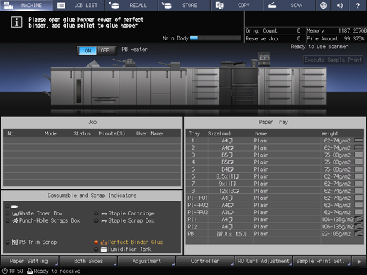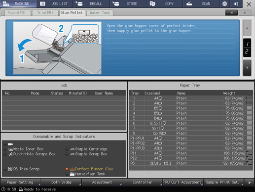 When Perfect Binder PB-503 is out of glue pellets, warm-up of the binder cannot be complete, resulting in the binding operation unavailable. In this case, the following message will appear in the message area of the screen.