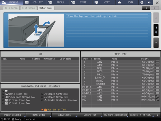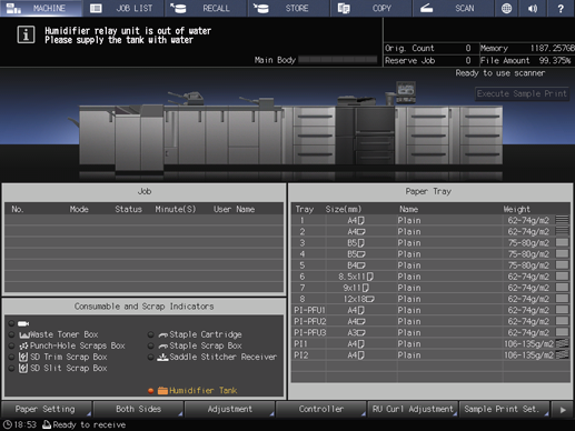 When water supply from the humidifier tank of Humidifier HM-103 (optional) that is mounted to Relay Unit RU-518 becomes empty, the curl adjustment by humidification becomes suspended. In this case, the following message will appear in the message area of the screen.