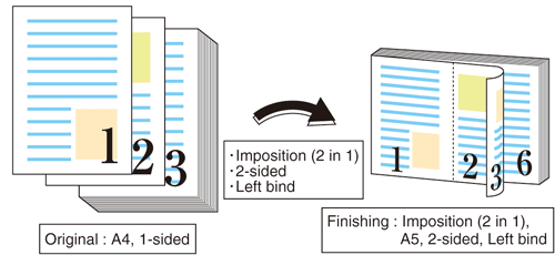 Impose an A4-size PDF document with 32 pages on A4 papers by 2 in 1 (reduced size), and then print with 2-sided.
