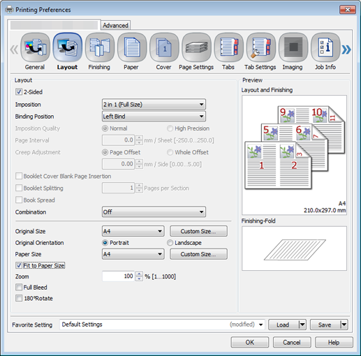 When setting in the printer driver, make sure that there are no previous settings left in each item in the tabs Layout, Finishing, Cover, etc.