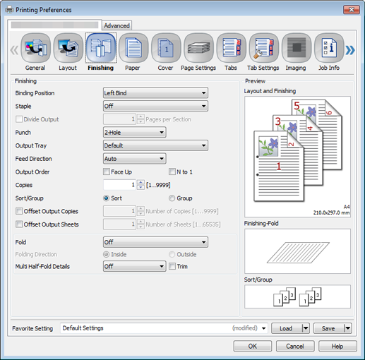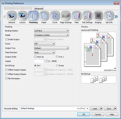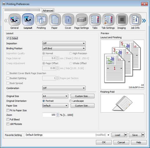 When setting in the printer driver, make sure that there are no previous settings left in each item in the tabs Layout, Finishing, Cover, etc.