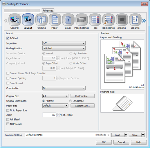 When setting in the printer driver, make sure that there are no previous settings left in each item in the tabs Layout, Finishing, Cover, etc.