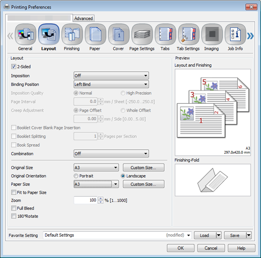 When setting in the printer driver, make sure that there are no previous settings left in each item in the tabs Layout, Finishing, Cover, etc.