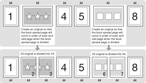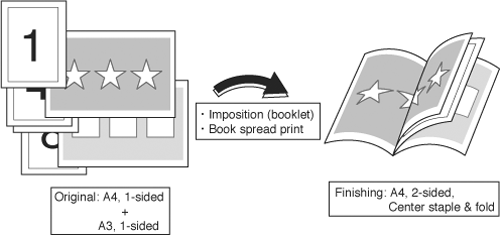 This function imposes the larger original in a book spread when printing the original, which has a different size for each page, as a booklet. For example, when printing original data including A4 and A3 documents, finish A3 documents in book spreads.