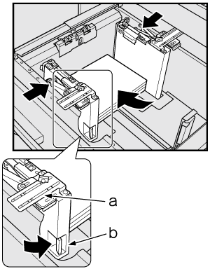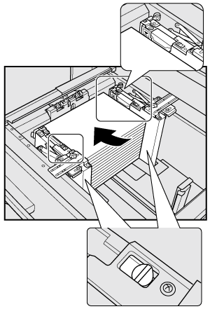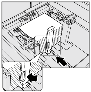 supplementary explanationPlace about 100 sheets of paper with the print side up. While pushing the lock release lever of the front side guide plate, align both side guide plates to the paper and position them according to the paper size indicator provided on the guide holding plate.
