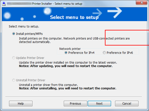 • supplementary explanationWhen Printers/MFPs are detected on both IPv4 and IPv6, you can specify Preference for IPv4 or Preference for IPv6.