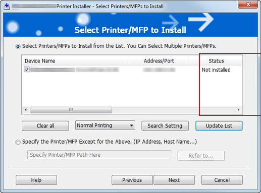 • supplementary explanationFrom among the connected printers/MFPs, the models corresponding to the printer driver appears in the list. If multiple models appears, check the IP address.