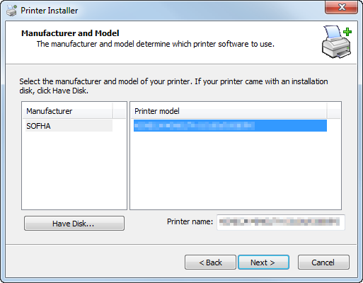 • supplementary explanationThe list of printer model displays all printers that you can install. If there is no desired printer name, click Have Disk and select the Setup.inf file.